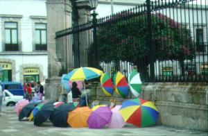 Der Zókalo »Plaza Mayor« ist einer der schönsten ganz Mexikos. Hier und am nahegelegenen Plaza Hidalgo liegen viele kleine Restaurants, die von Touristen und Mexikanern gleichermaßen besucht werden. Da sitzt man am späten Nachmittag, trinkt einen der sehr preiswerten, frisch gepreßten Fruchtsäfte oder ein Bier und ist einfach nur da. Zu sehen gibt es immer etwas: Da stehen hunderte meist junger Männer und Frauen in einer langen Schlange vor dem einzigen Kino um den neusten Schwarzenegger-Film an, der Schuhputzer diskutiert die Niederlage der Nationalelf, ein Familienvater verlädt Frau, ein halbes Dutzend Plastiktüten und seine zwei Kinder aufs Motorrad. |